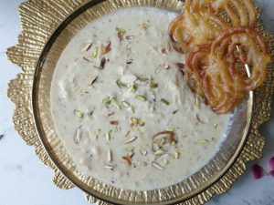 In a serving bowl,add rabri,sprinkle almonds,pistachios & refrigerate until chilled.