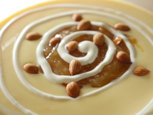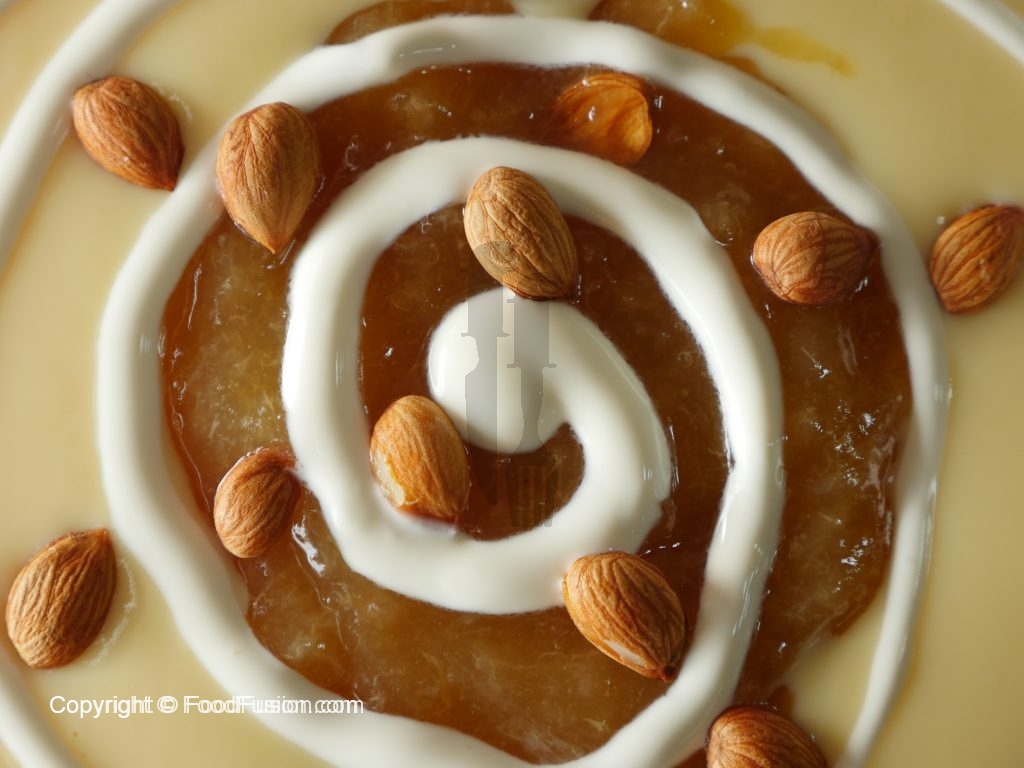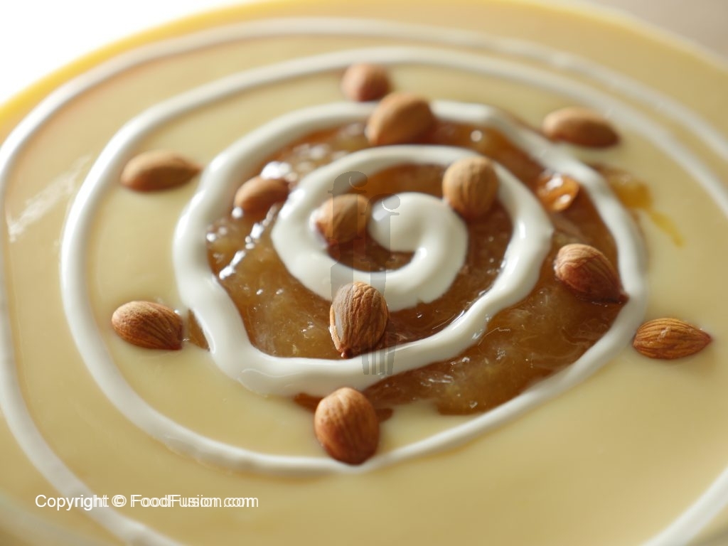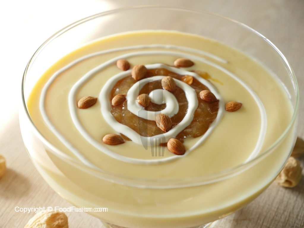 Serving bowl cooked khubani mixture aur tayyar custard dal dein aur cooked khubani mixture,cream aur khubani ka badam sa garnish ker ka serve karein.