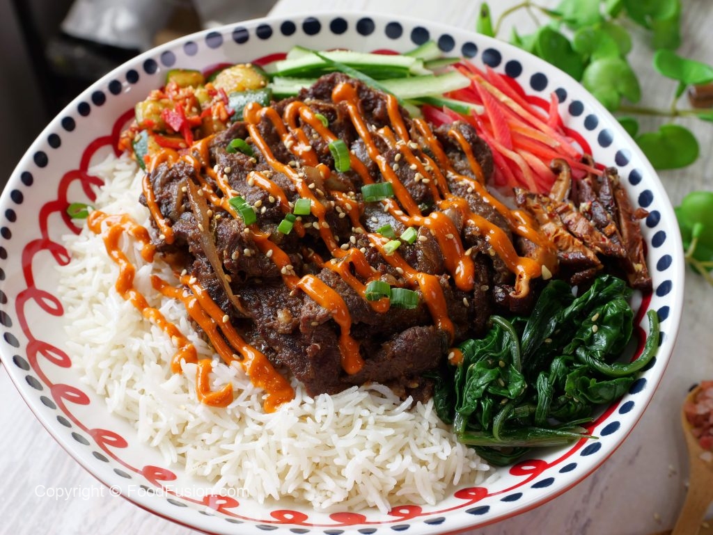 -In a serving bowl,add cooked rice,beef bulgogi,steamed spinach,stir fried shiitaki mushrooms,carrots, cucumber & kimchi.