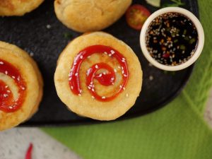 -Veg filling or cheese filling ko dough ka center mein dal dein aur tamam sides ko gather ker ka pinch & seal ker lein.