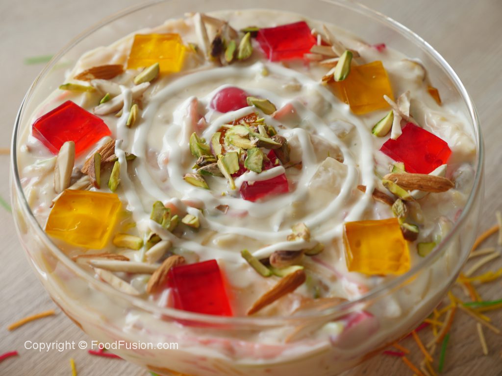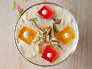In serving dish,add red and yellow jelly,lab e shireen and garnish with red jelly,yellow jelly,dry nuts,cream & serve.
