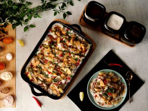 In bowl,add lemon juice,garlic water,cumin seeds,carom seeds,garam masala powder,red chili crushed, coriander seeds,salt,red chili powder,turmeric powder and mix well.