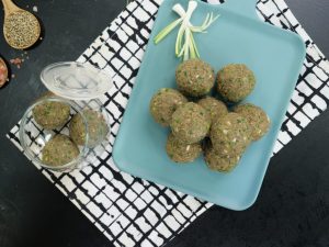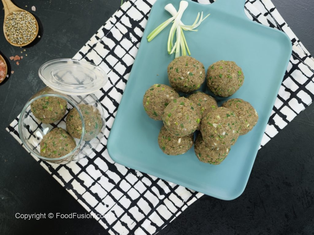Take a small quantity of mixture (50g) & make ladoo of equal sizes (makes 12).