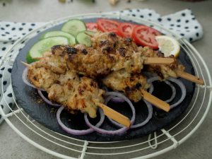 Marinated chicken ko wooden skewers per laga lein (makes 9-10).