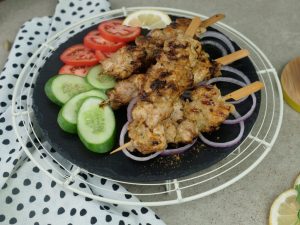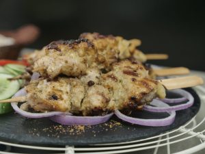 Thread marinated chicken into wooden skewers (makes 9-10).