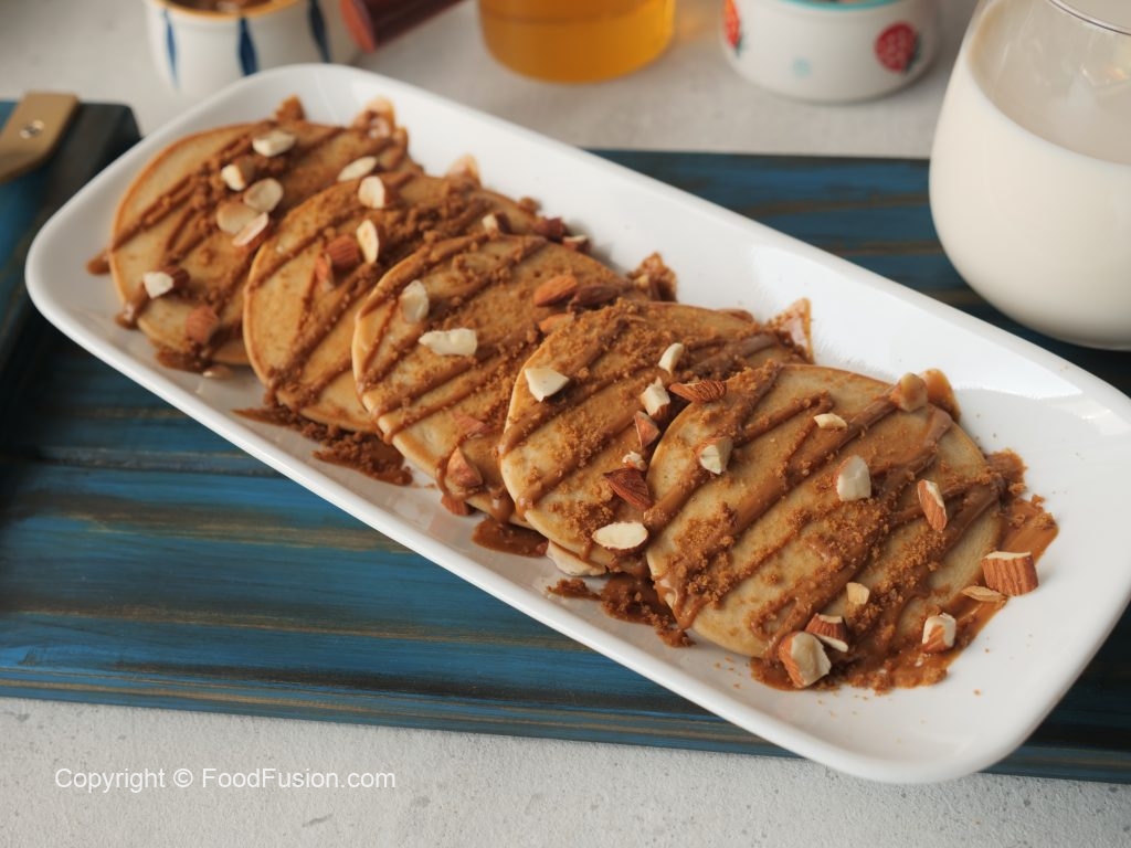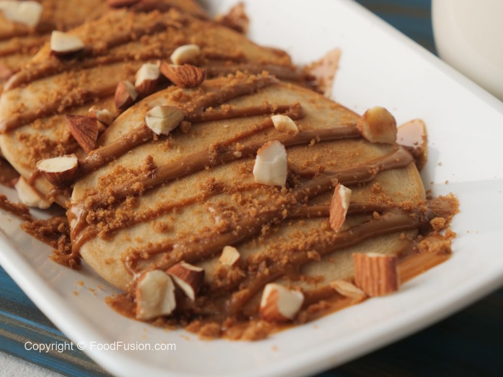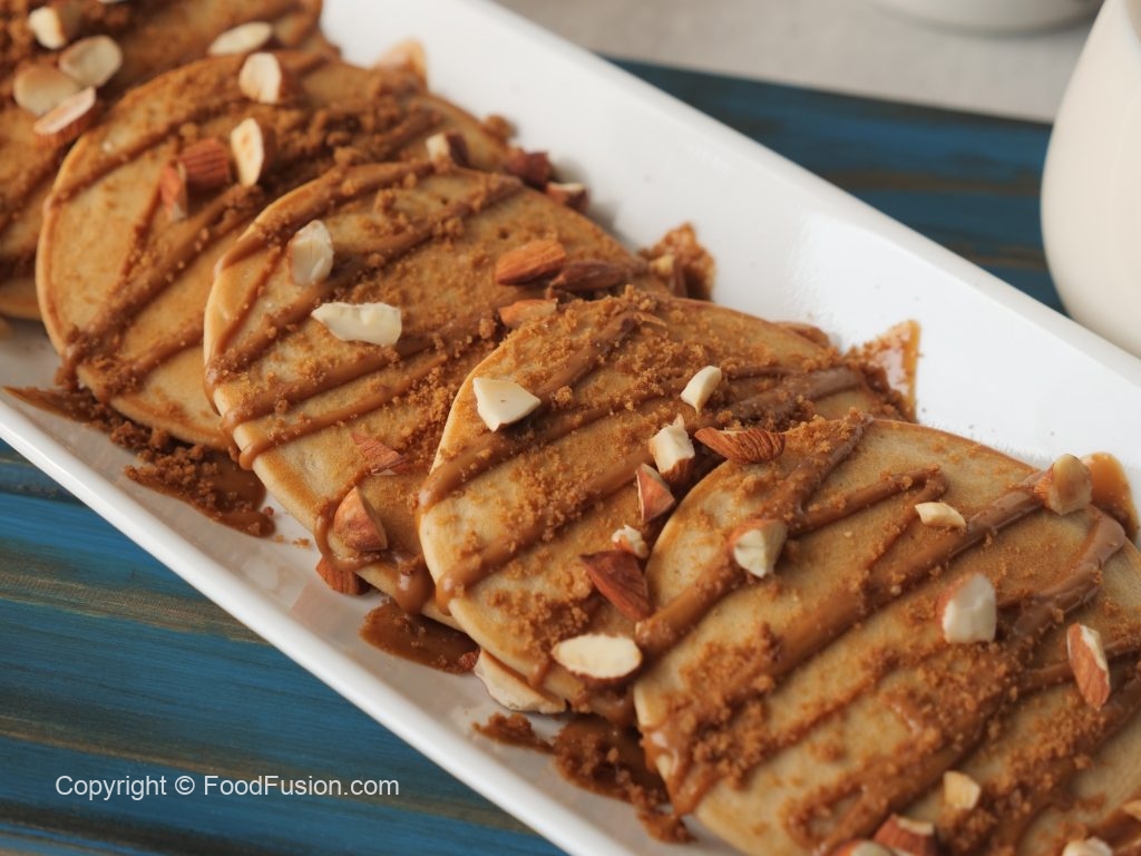 On serving plate,place lotus pancakes,drizzle lotus spread,sprinkle crushed caramel biscuit,almonds & serve!