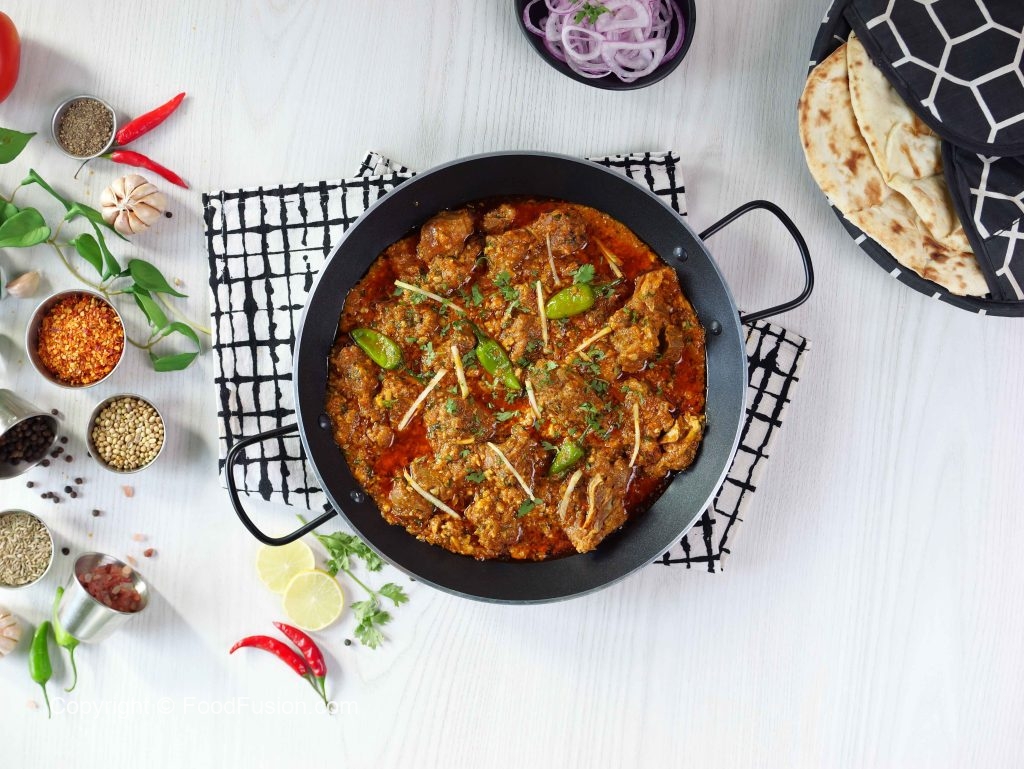 -Karahi mein cooking oil,mutton,pink salt aur makhan daal kar dhak dein,chulha on karein aur darmiyani ancch per makhan melt hone dein phir achi tarah mix kar ke high flame par 4-5 minutes tak paka lein.