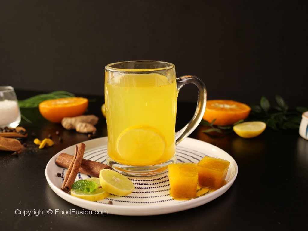 -In a blender jug,add peeled lemon,ginger,turmeric powder,black pepper powder,cinnamon powder, garlic,apple cider vinegar,orange juice,water & blend well.