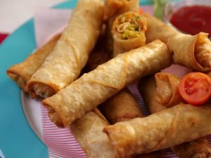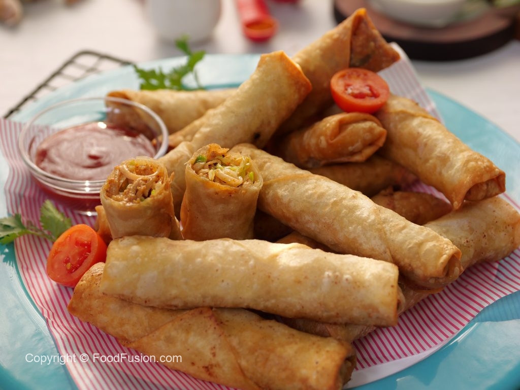 -Cut roll sheets diagonally,making a triangular shape,take one triangle sheet,add prepared filling,apply flour slurry,fold & roll up (makes 18-20).