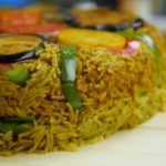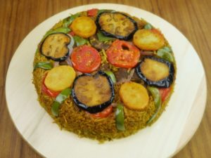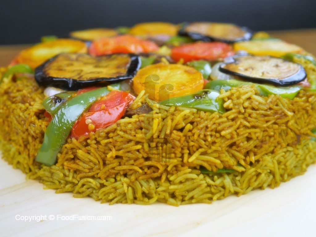 Ab is mein fried aloo slices,deep fried baigan slices,fried pyaz rings,fried shimla mirch dal ker upper sa remaining cooked chawal ki layer laga lein aur halka sa press ker lein.