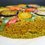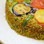 Now add deep fried potato slices,deep fried eggplant slices,fried onion rings,fried capsicum and add a layer of remaining cooked rice and press gently.