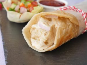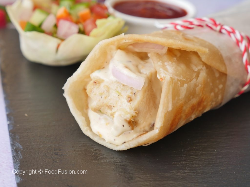 On paratha,add prepared creamy white sauce,chicken malai boti,onion,creamy white sauce, fold to make a roll,wrap in butter paper & serve! (Makes 4).