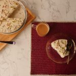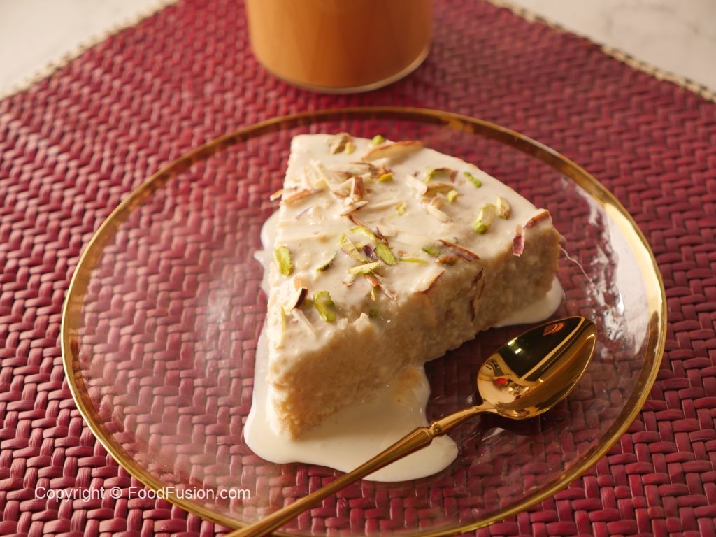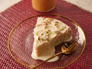 Slowly pour prepared milk malai syrup over the top of the cake,filling holes.