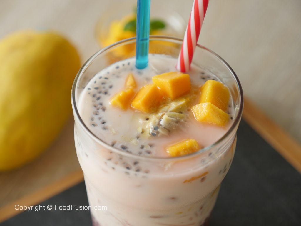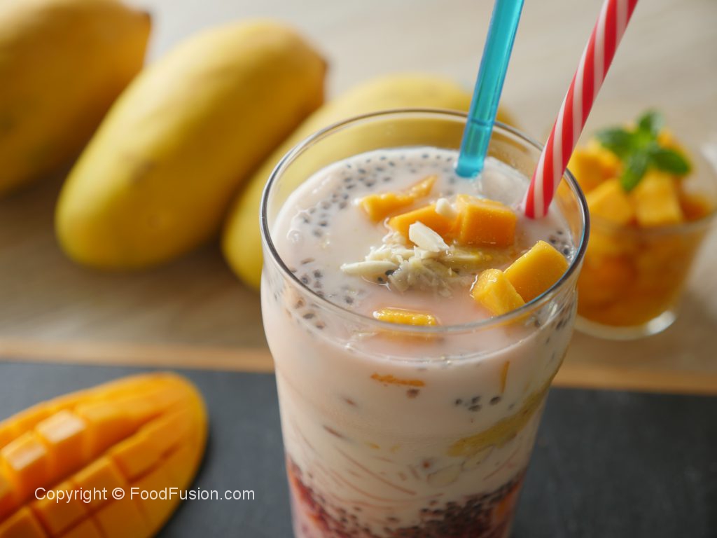 In serving glass,add mango cubes,basil seeds,red syrup,ice cubes,corn flour vermicelli,almonds,mango kulfi,chilled prepared milk,basil seeds,almonds,mango cubes & serve!