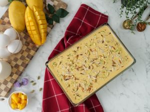 -Tayyar mango malai milk ko cake ka upper dal ker holes ko fill ker lein (reserve 1 cup for later use), cling film sa cover karein aur thanda ho janay tak refrigerate ker lein.