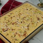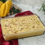 -Slowly pour prepared mango malai milk (reserve 1 cup for later use) over the top of the cake, filling holes,cover with cling film & refrigerate until chilled.