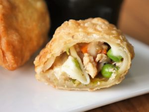 -Add cooked chicken,fold the mixture into a roll shape than move the potato roll to one side of pan.