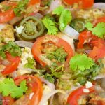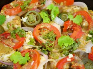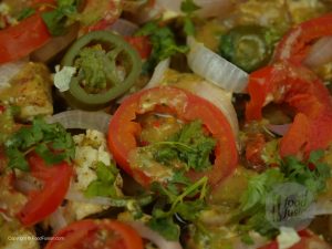 Now spread onion (round slices), tomato (slices), jalapenos and garlic (chopped).