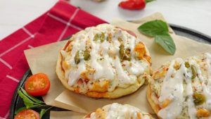-Turn off the flame,on cooked naan,add & spread pizza sauce,add cooked chicken,prepared alfredo sauce,cheddar cheese,mozzarella cheese,pickled jalapenos,sprinkle red chilli crushed & dried oregano,cover,turn on the flame & cook on low flame until cheese melts (3-4 minutes).