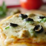 Spread pizza sauce,add cooked chicken,onion,cheddar cheese,capsicum,mozzarella cheese,black olives and dried oregano.