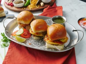 Mini bun kababs ko chutney & pyaz rings ka saath serve karein.