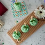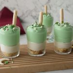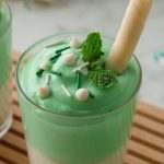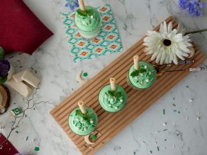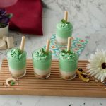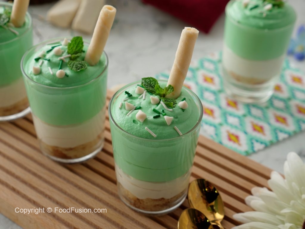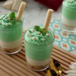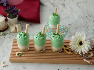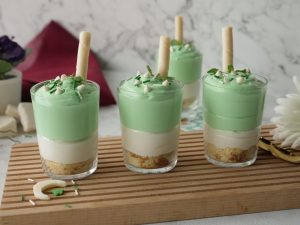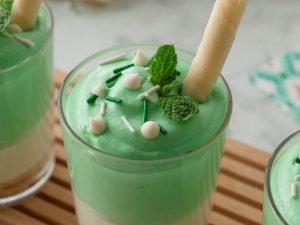 Add a layer of white mousse then green mousse & garnish with green & white sprinkles, white chocolate chips & wafer biscuits & serve!