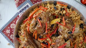 -On serving platter,add cooked rice,mutton pieces & garnish with carrots & black raisins & serve with tomato chutney!