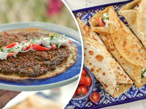 Naan per chicken,pyaz,tamatar,band gobhi aur chutney dal dein.
