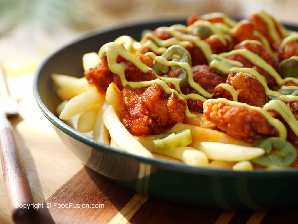 -In a serving dish, add fries, prepared Nashville cheese sauce, crispy chicken, jalapenos, honey mustard sauce & serve!