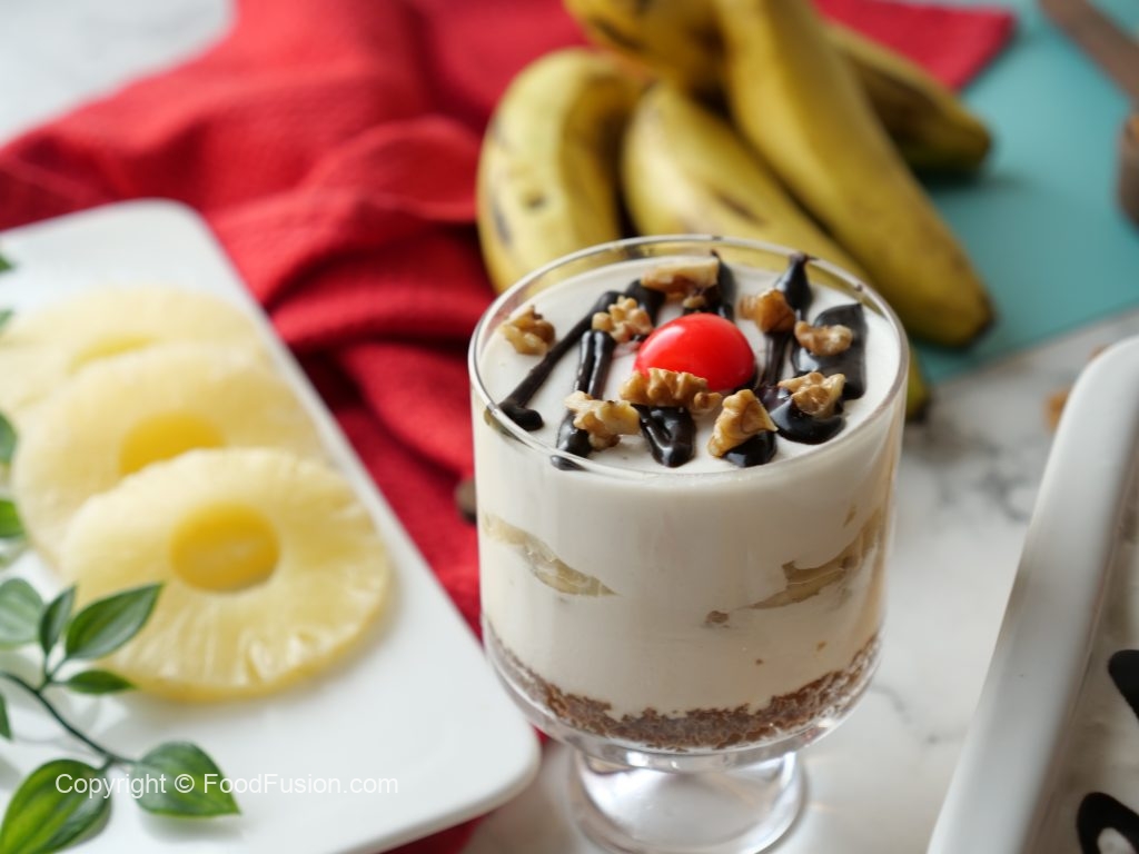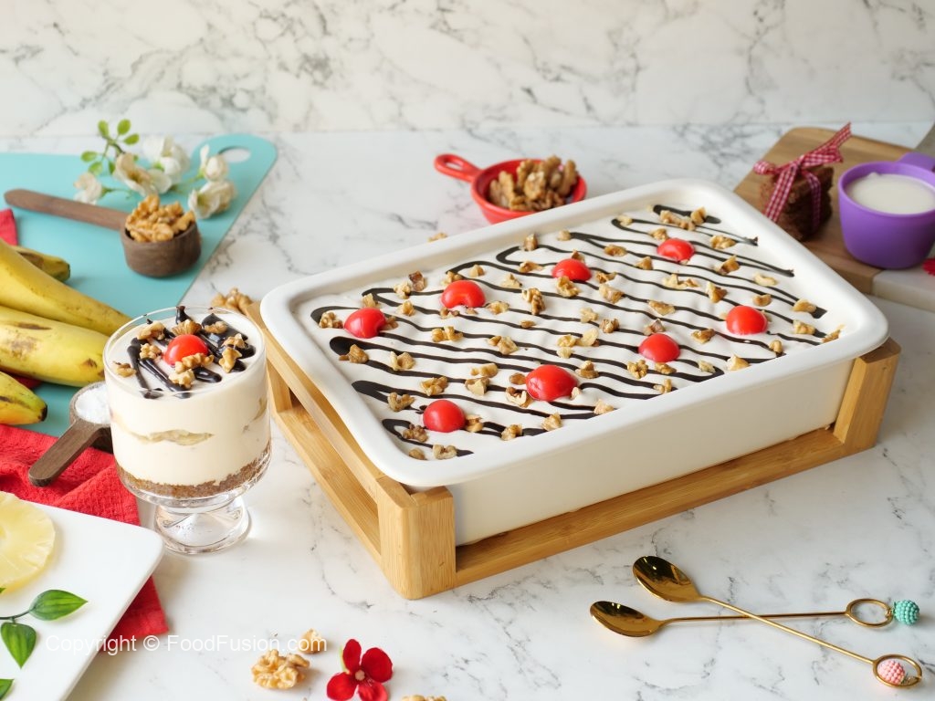 No Bake Banana Split Cake is Super Quick and always hit. Layers of Bananas topped over with the goodness of Olper’s Dairy cream make this dessert so decadent. #OlpersDairyCream #GoodnessBarhjaye #FoodFusion #olpers #HappyCookingToYou #Cake #Recipes