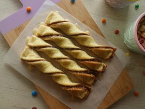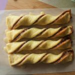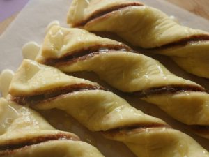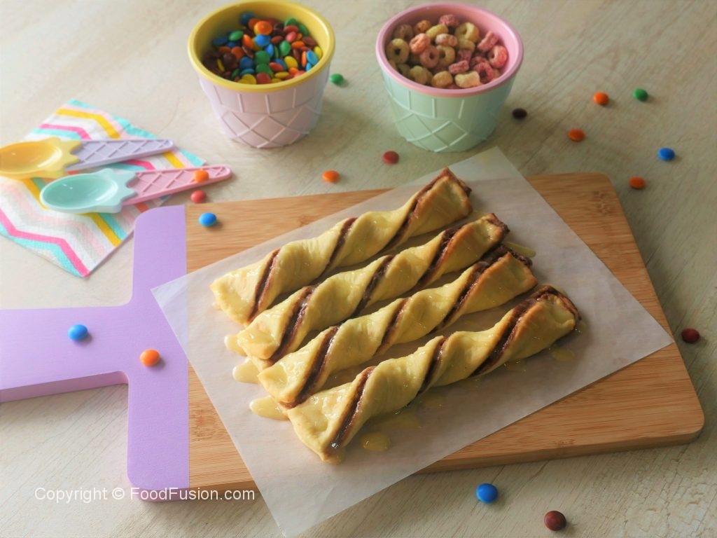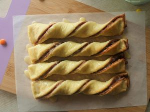 On baking tray lined with butter paper,place nutella strips and holding it at one end,carefully twist it several times until it forms a spiral and let it rest for 20 minutes.