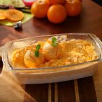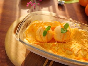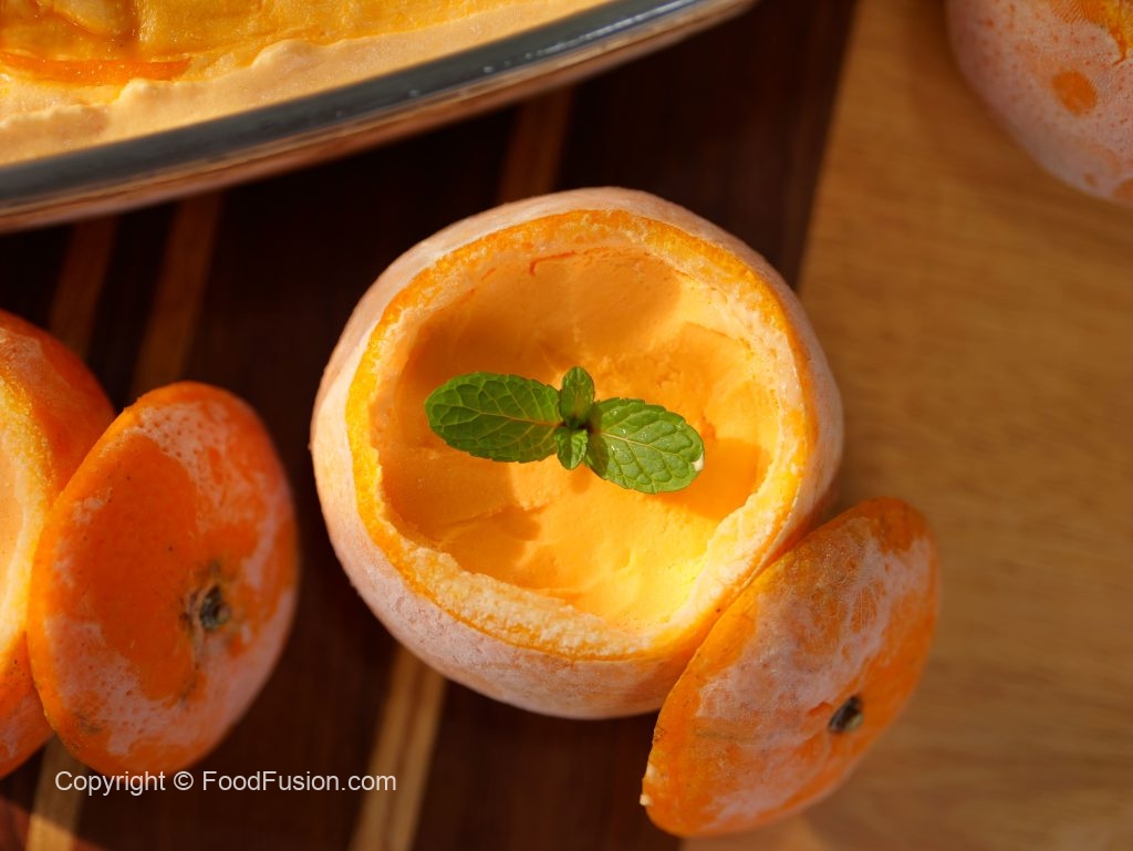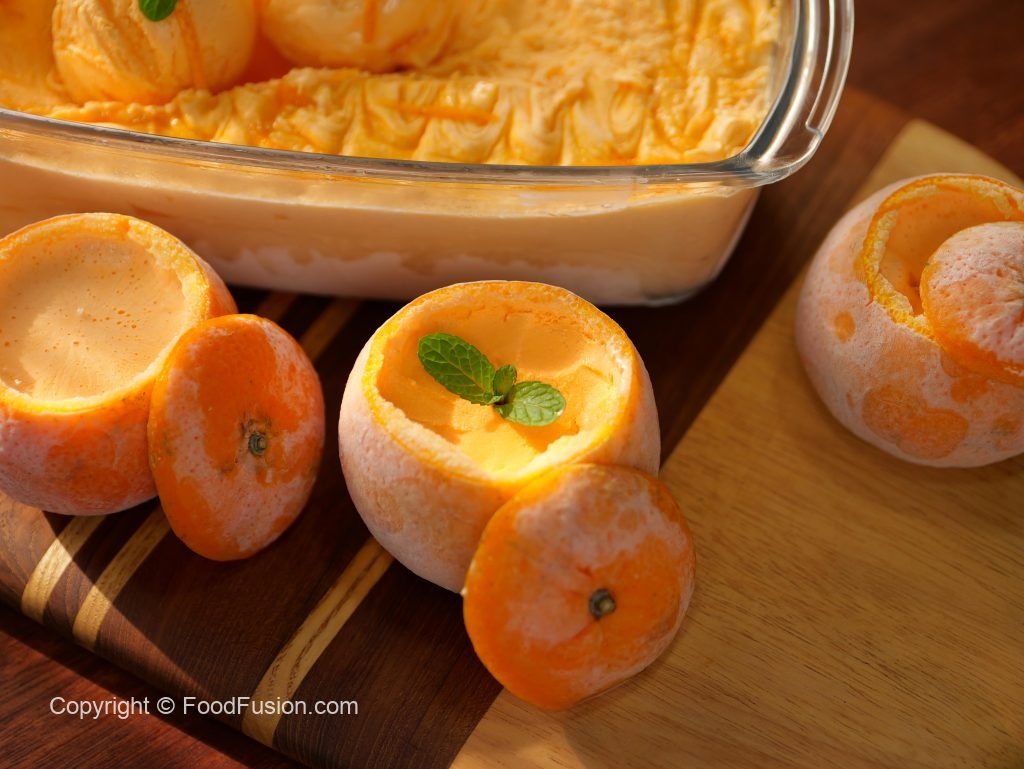 -Pour in a loaf pan, add orange syrup (Cook ½ cup orange juice with ½ cup sugar until thickened. Once cooled, your syrup is ready to use) & orange garnish, cover & freeze for 8-10 hours or overnight.
