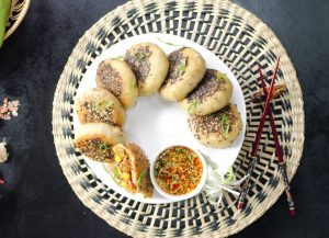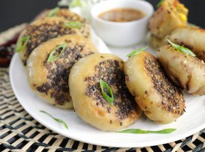 -In a frying pan add cooking oil, prepared veggie buns (sesame seeds side down) & fry on low flame until golden.