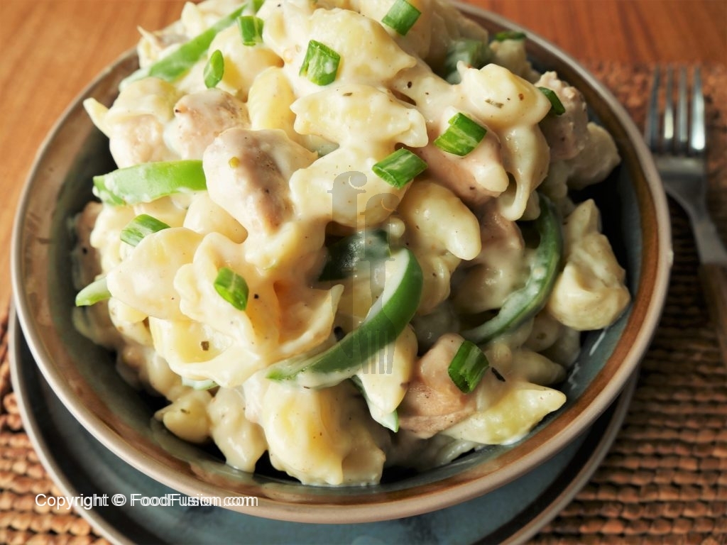 In white sauce,add stir-fried vegetables,cooked chicken,boiled shell pasta and give it a good mix.