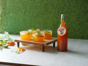 -Serving glass mein ice cubes,peach slices,tayyar peach drink aur podina dal kar serve karein!