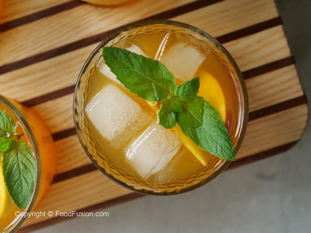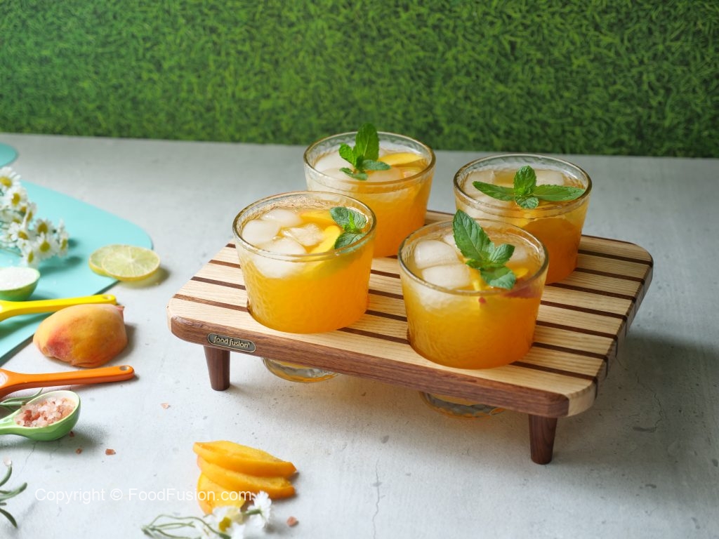 -In a serving glass,add ice cubes,peach slices,prepared peach drink,mint leaves & serve!