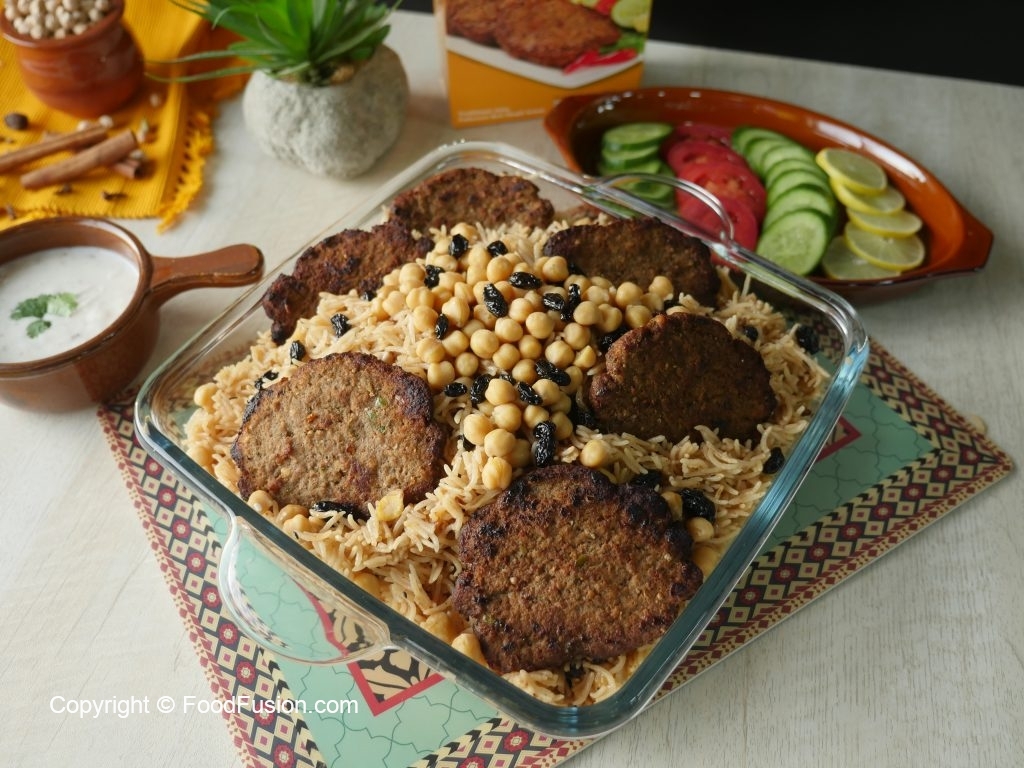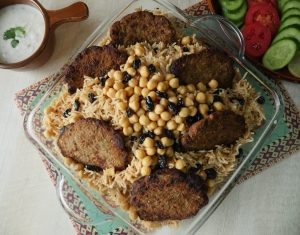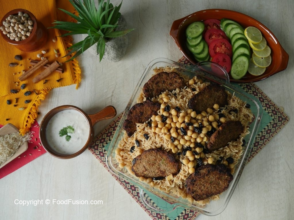 On serving dish,add cooked rice,chickpeas,reserved black raisins,peshawari beef chapli kabab on top and serve!