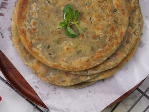 Add & spread ghee & sprinkle prepared mint spice mix.