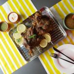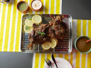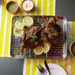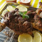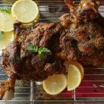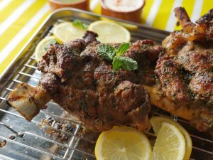 On baking tray,place cooked mutton leg and with the help of the brush,apply prepared mint mixture.