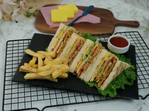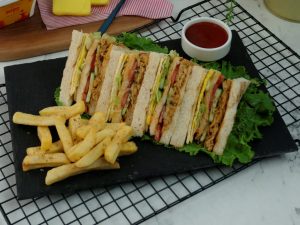 On a bread slice,add & pullled chicken filling,cucumber slices,tomato slices,place another toasted bread slice,drizzle tomato ketchup,iceberg,prepared egg,cheddar cheese slice & top with toasted bread slice (makes 4-5 sandwiches).