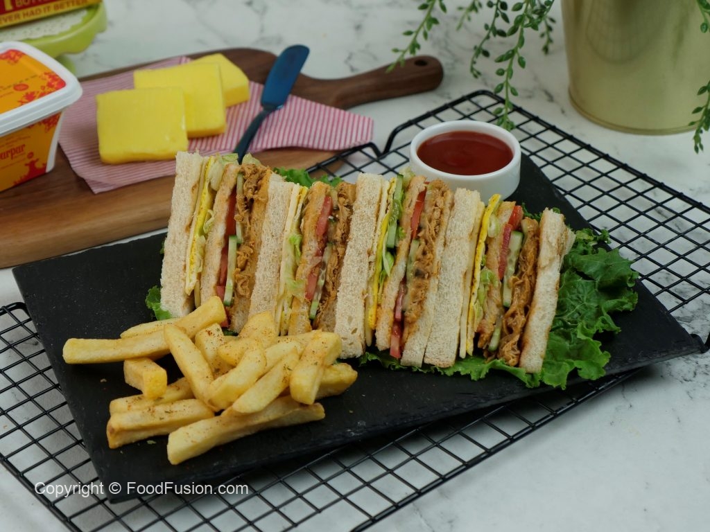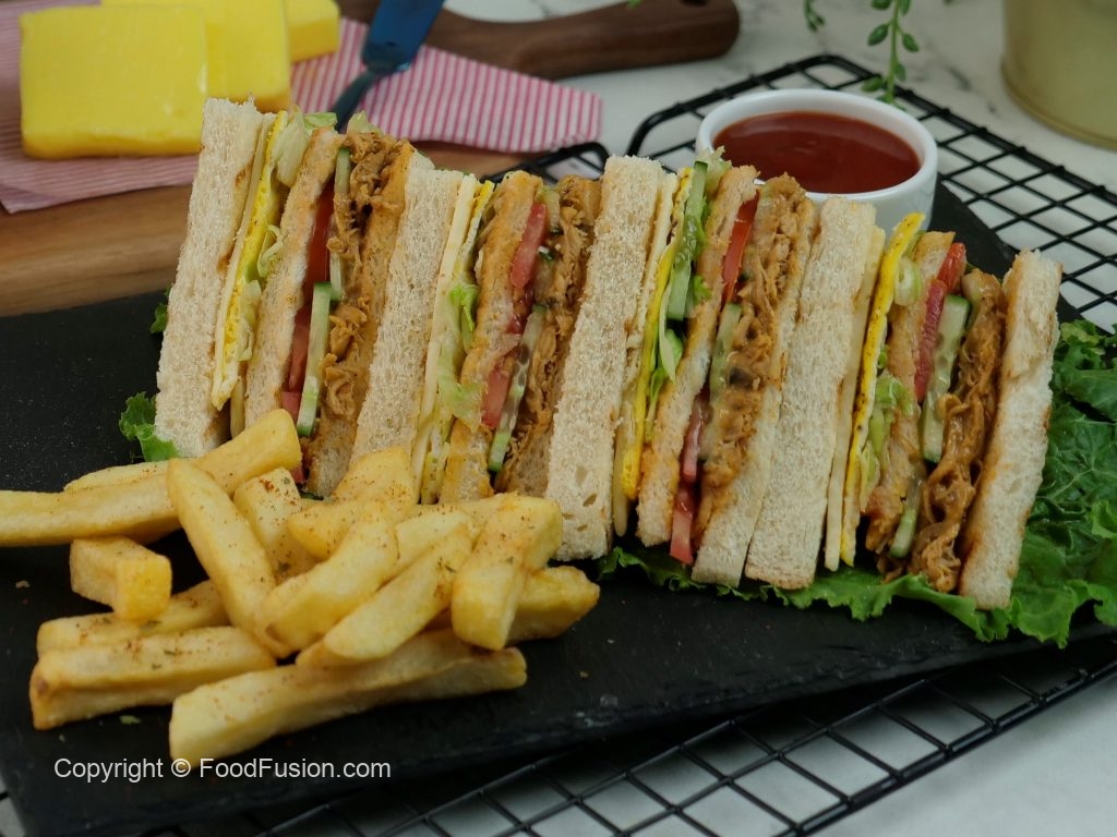 This Pulled Chicken Club Sandwich recipe will make you feel like you have made a discovery. Definitely a must try for everyone. A good sandwich need good butter like Nurpur. #HappyCookingToYou #FoodFusion #Nurpur