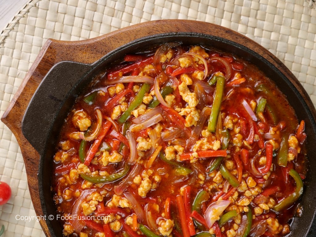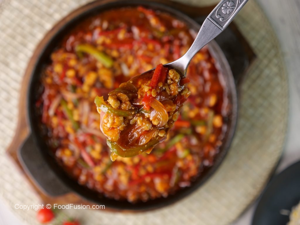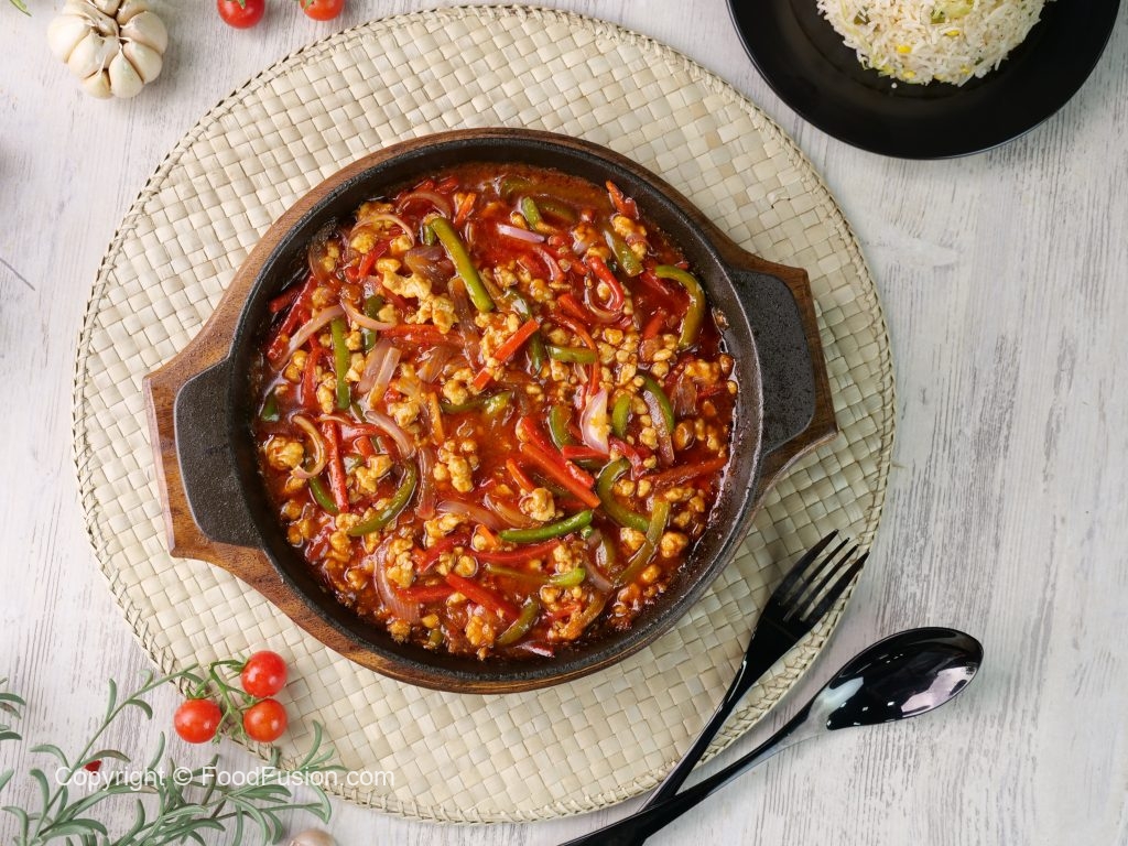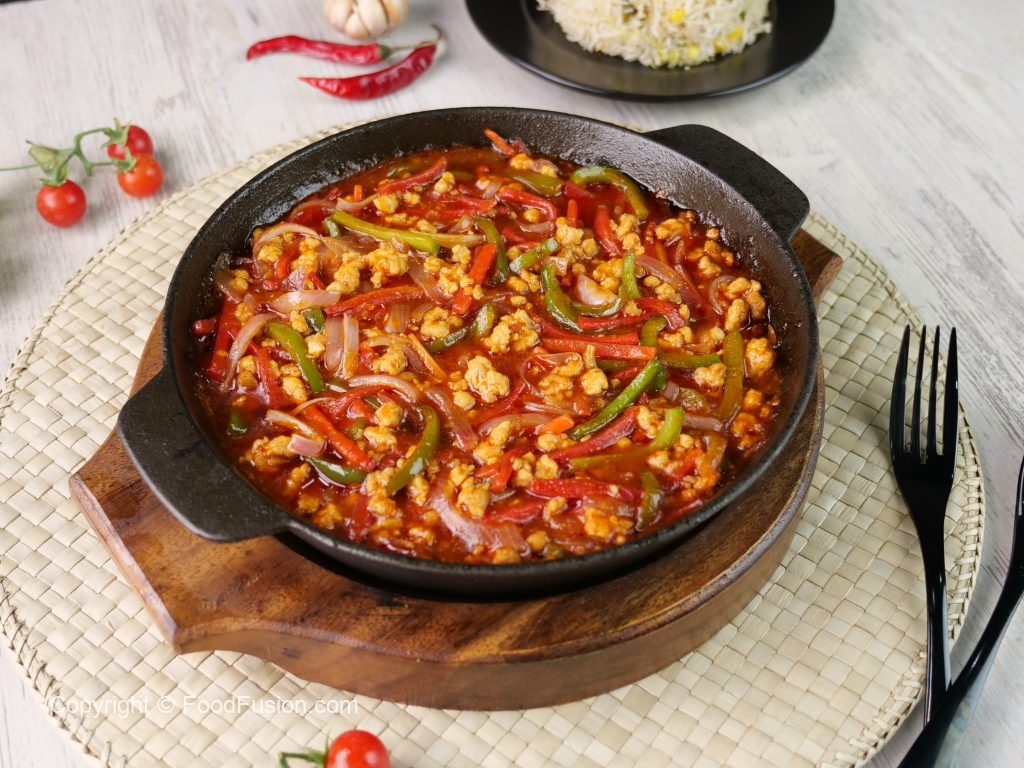 -Heat sizzler pan,add qeema manchurian & serve with fried rice!