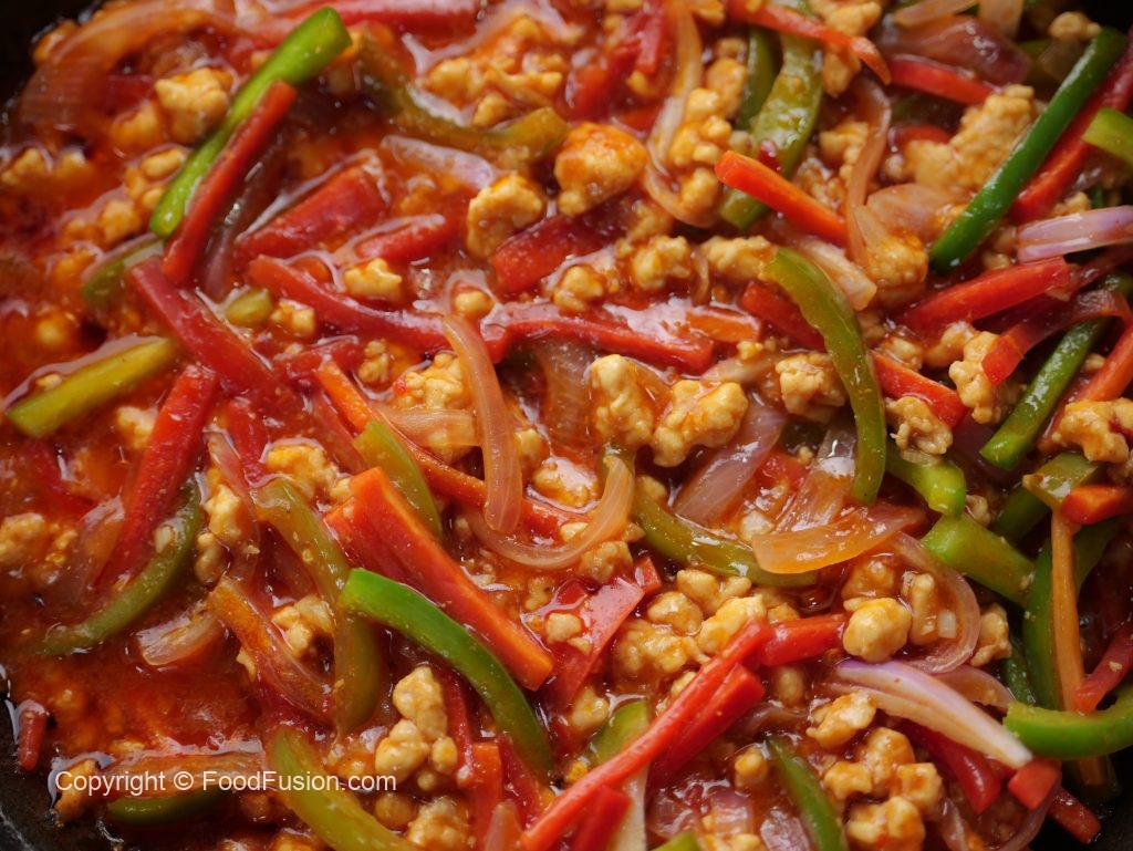 -Turn on the flame,in the same wok,add cooking oil,chicken mince & mix well until it changes color.