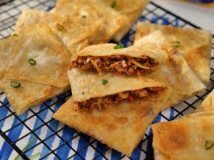 -On roll sheet,add prepared filling (2 tbs),apply flour slurry & fold to make a parcel shape (makes 14).