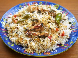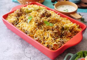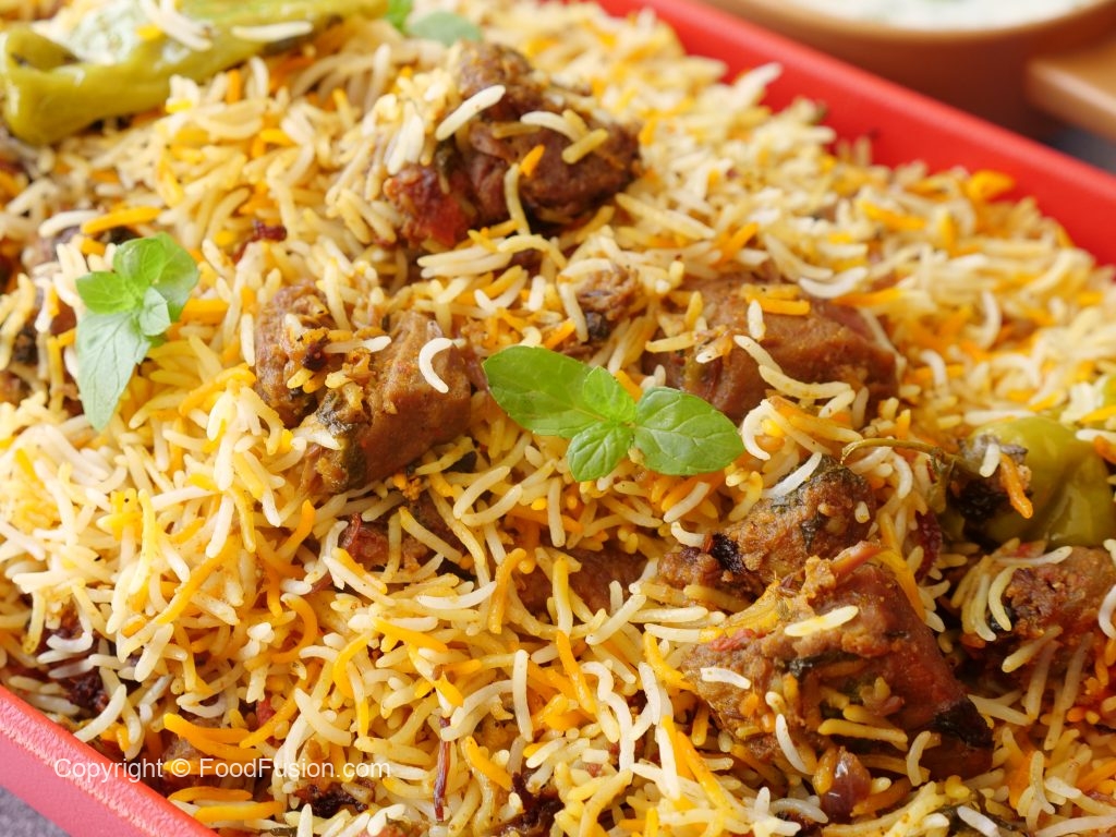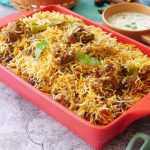 Now add dissolved food color and fried onion,cover and steam cook on low flame for 18-20 minutes.