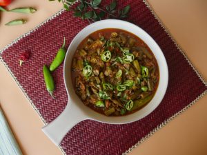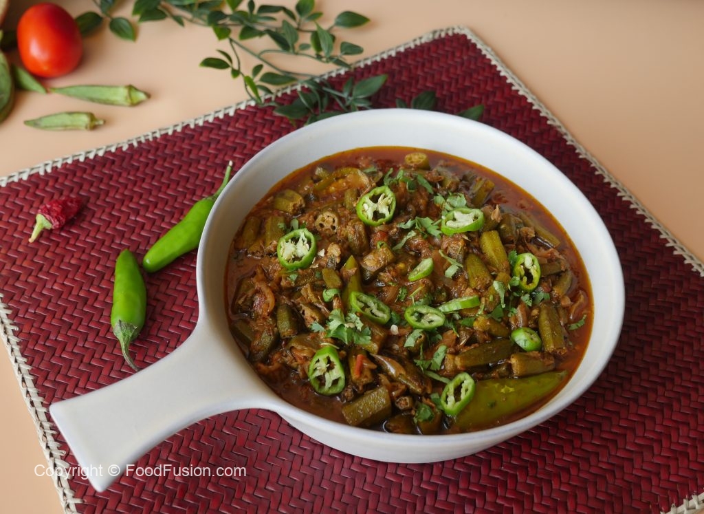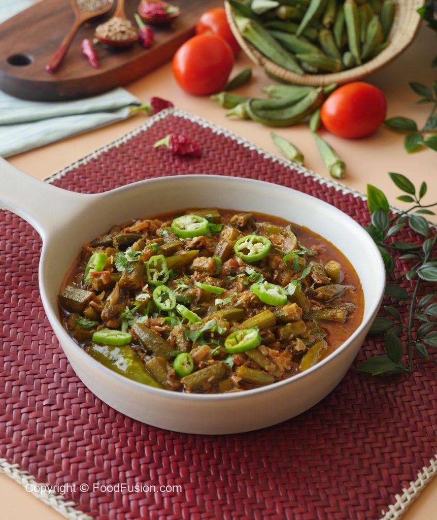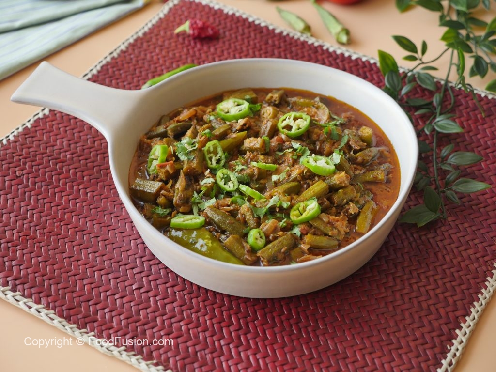 In a wok heat oil, add onion, okra, green chilies, mix well and fry them for 5-6 minutes on high flame or until golden brown. Takeout and set aside.