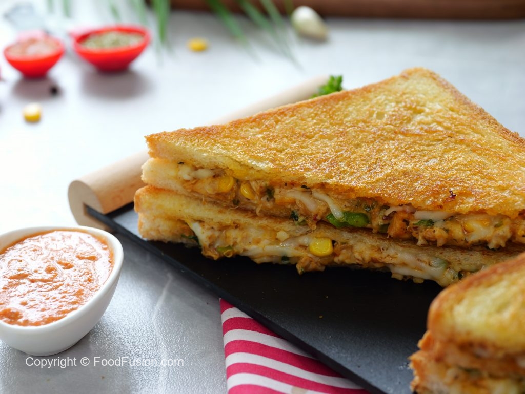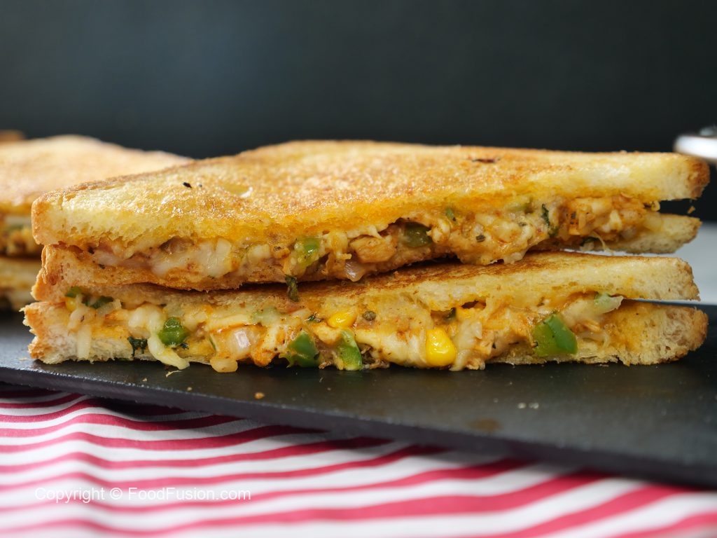 -Flip the prepared sandwich in a frying pan (butter side down),apply butter,cover & grill/cook on very low flame from both sides until golden & crispy (makes 4 sandwiches).