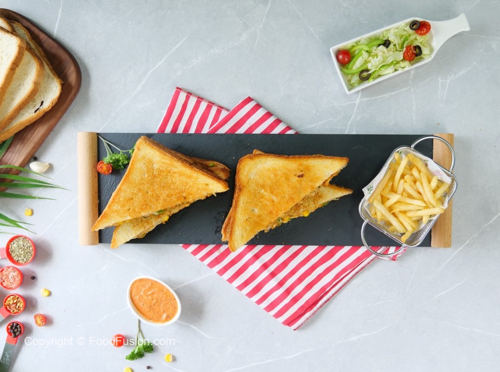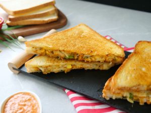 -On two large bread slices,apply butter,add & spread prepared filling on one bread slice & flip the other bread slice & apply butter.