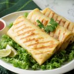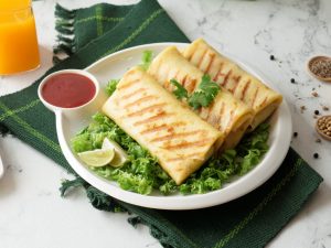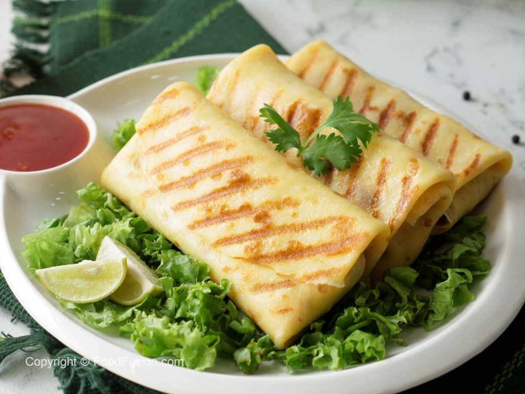 Grease grill pan with cooking oil & grill folded crepe from both sides until golden brown (1 minute each side) (makes 9-10).