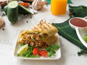 Take out crepe on a clean surface,add cabbage,cucumber,tomatoes,capsicum,prepared tahini mayo sauce (1 tbs),prepared shawarma filling,fold all sides & roll it.